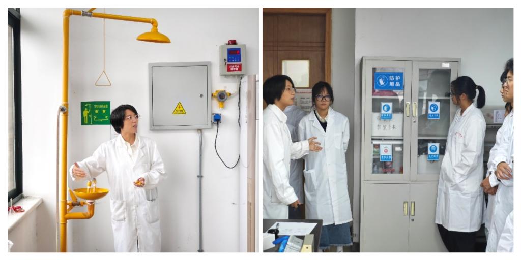 演练开始前,实验室副主任陈丹老师以近十几年实验室安全事故为例,指出发生实验室安全事故的主要原因是违反了操作流程,其中百分之八十为危化品引起。随后就实验室的安全防范及进入实验室的注意点进行全面讲解,介绍了防护用品柜,并示范了喷淋装置的使用。