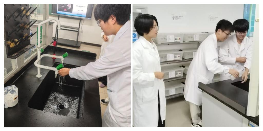随后,在危化品安全事故应急处理方法环节以实验室常用的酸、碱溶液溅到皮肤的急救处置方式为例进行讲解,并在现场开展了模拟操作演练。同学们演练了事故现场报告、事故现场处置及调查分析等应急处置过程。