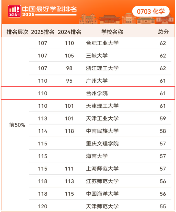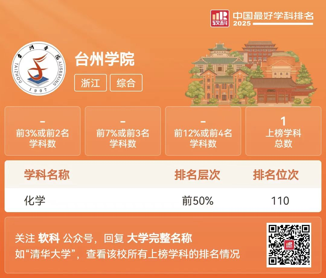 2025年10月15日,高等教育评价专业机构软科正式发布“2025软科中国最好学科排名”。榜单显示,全国共有517所高校的5344个学科点上榜。我校化学学科在此次排名中位列全国高校并列第110名,并在浙江省高校中排名第8位。这一成绩标志着化学学科建设再上新台阶,是继2023年入选软科世界一流学科、2024年进入ESI全球排名前5‰后的又一重要突破。
