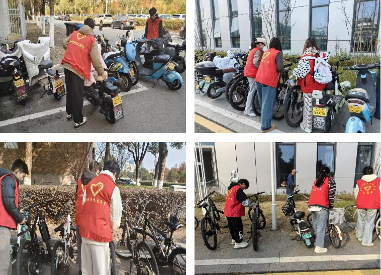此次志愿服务聚焦校园交通关键区域,以医化大楼、科技综合楼、学生寝室楼、教学楼周边为重点,针对自行车违规占道、电动车随意停放、车辆排列杂乱等影响通行安全与校园美观的乱象,开展集中整治。活动前期,志愿者们提前制定详细的分工方案,明确负责范围。尽管天气寒冷,但志愿者们身着红色马甲,个个热情高涨、干劲十足。在各个责任区域,大家分工协作、默契配合:有的弯腰扶起倒地的自行车,细心擦拭车身上的灰尘;有的耐心调整车辆车头方向,确保所有车辆 “同向列队、整齐划一”;有的将零散停放、占用消防通道的电动车逐一移至指定停放区域,并为车主贴上温馨提示贴;还有的志愿者主动向过往同学宣传文明停放知识,引导大家自觉遵守校园交通秩序。