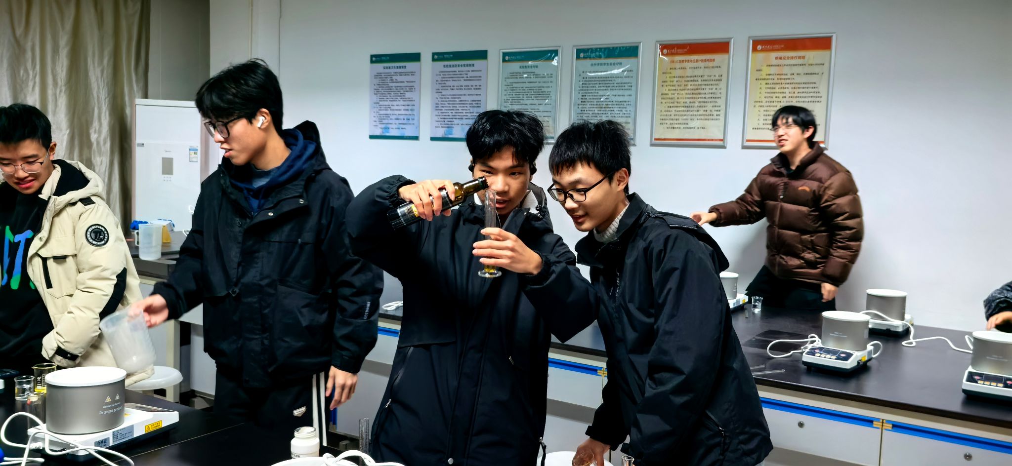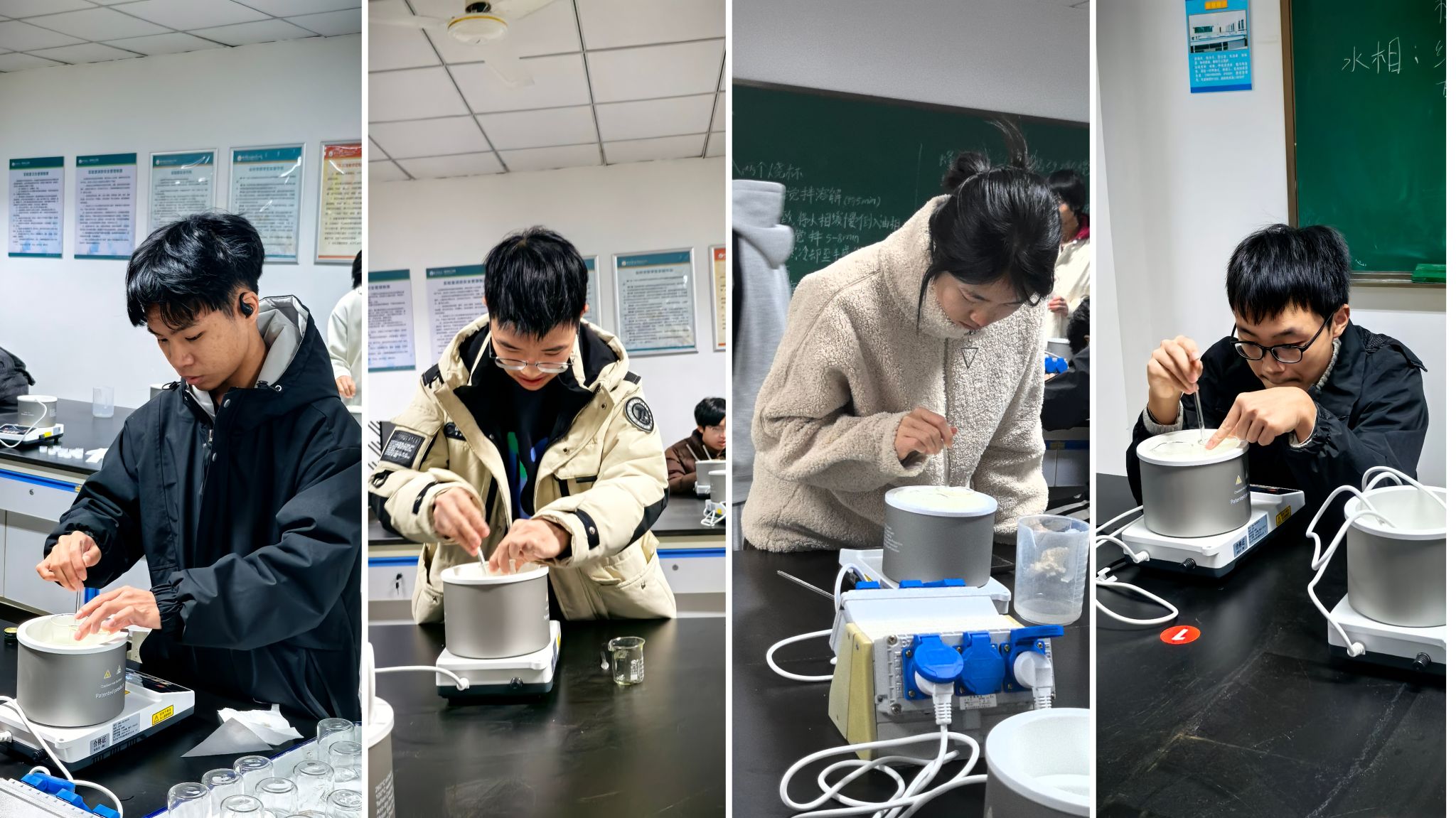 为确保活动顺利推进,师生双方前期筹备工作细致扎实。社长杨文浩牵头确定科学可行的制作方案,指导教师陈丹全程跟进,严格把控原材料质量,部分核心原材料得到了学校老师及校友的大力赞助。护手霜制作环节被巧妙设计为小型对比实验。同学们根据统一基础配方,围绕油相原料展开个性化探索,分别选用甜杏仁油、橄榄油进行调配。从精准配料、加热乳化到观察质地变化,大家亲手操作每一个步骤,直观感受不同油脂对护手霜膏体细腻度、皮肤吸收效果及滋润持久度的细微影响,现场交流探讨不断,将课堂所学的化学理论与实践操作深度结合。灌装阶段,同学们用注射器小心翼翼地将温润乳霜注入空管,看着亲手制作的护手霜逐步成型,脸上洋溢着满满的满足与自豪。唇膏制作环节,同学们先按照含乳木果脂的标准配方制作基础款唇膏,部分同学主动设计“去除乳木果脂”的实验,通过对照实验验证乳木果脂对唇膏硬度、滋润度及使用肤感的关键作用。精确称量原料、严格控制融化温度、谨慎完成灌装,每一个步骤都彰显了大家的严谨态度与探索热情。