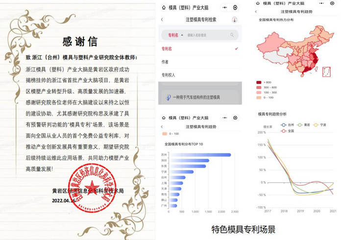 4月16日,我校浙江(台州)模具与塑料产业研究院收到一封来自黄岩区经济信息化和科学技局的感谢信,信中对我校模具与塑料产业研究院构思及承建的“模具专利”场景给予了高度认可和肯定。