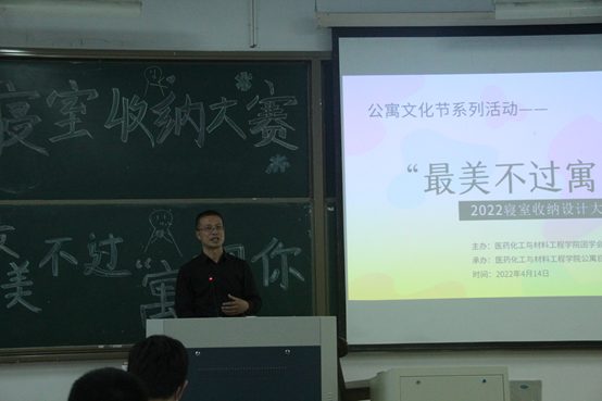 为营造良好的公寓文化氛围,展示干净整洁、积极向上的公寓建设文化内涵,医化学院近日特举办最美不过“寓”见你寝室收纳设计大赛活动评选现场评委团成员由学院党委副书记吴高都、学院团委指导老师潘汉雄、班主任代表杨涛组成。此活动获得了同学们的积极响应,营造了寝室如家、干净整洁的寝室氛围。