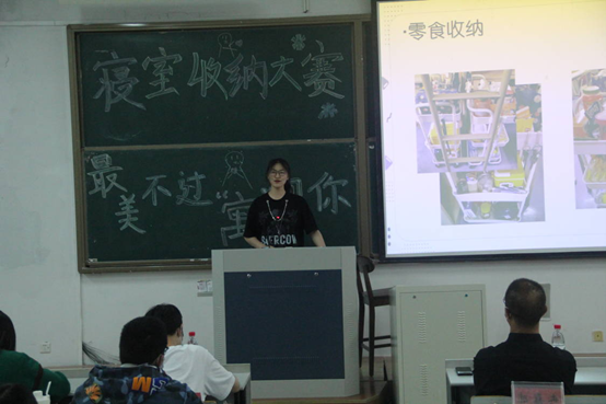 活动期间,同学们积极投身于寝室建设,积极探索寝室中可用空间,或繁中不乱,或简中俏皮,通过一个个意想不到的空间摆盘,展现了同学们的创新能力,营造了一个积极向上、健康和谐的宿舍环境。通过细节整理与设计开发,在有限空间中大展身手,不仅在宿舍空间的设计中表现出来丰富的创新能力,同时也在进行宿舍创意的过程中生动的体现出简洁、朴实、清新、可爱等个性特色,展现了当代大学生青春活力的形象与乐观向上的生活态度。决赛评审现场,各寝室代表通过PPT展示整洁舒适的寝室环境。最终,经过激烈的角逐,8-413寝室获得一等奖,11-1398-403寝室获得二等奖,获得三等奖的寝室是8-3278-3318-405