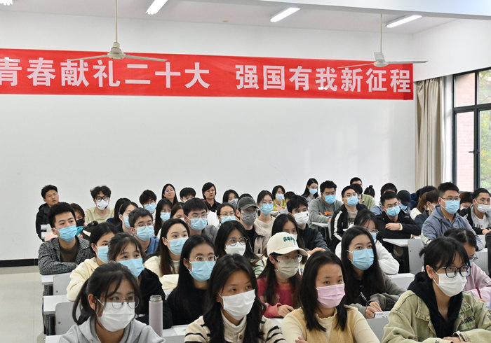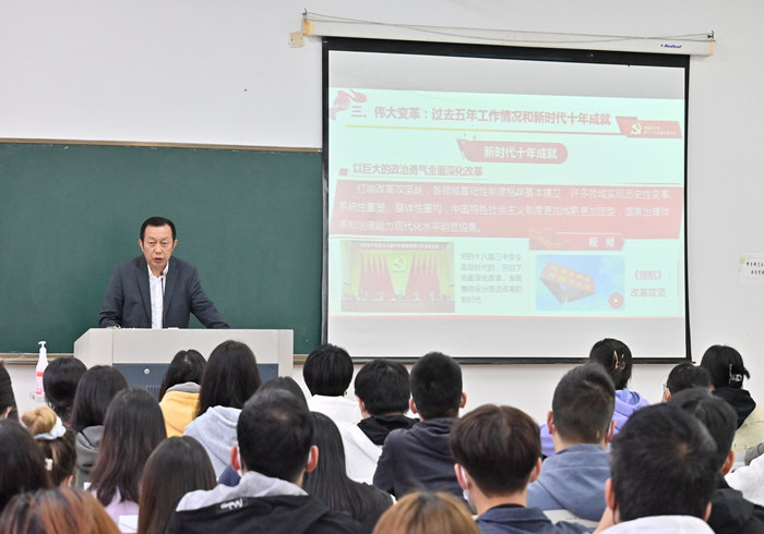 课上,乐传永校长指出党的二十大是在全党全国各族人民迈上全面建设社会主义现代化国家新征程、向第二个百年奋斗目标进军的关键时刻召开的一次十分重要的大会,科学谋划未来5年乃至更长时期党和国家事业发展的目标任务和大政方针。他用15个关键词带领学生们精准了解党的二十大会议主要内容,全面介绍中国共产党过去五年工作情况和新时代十年成就。他强调从现在起中国共产党的中心任务就是团结带领全国各族人民全面建成社会主义现代化强国、实现第二个百年奋斗目标,以中国式现代化全面推进中华民族伟大复兴。乐校长在讲授过程中将党的二十大精神与国情、党情、民情、校情有机融合,活化理论阐释,寻求思想共振,使这一堂特殊的思想政治课,在内容上体现政治热度,在思想上体现智慧深度,在讲授中饱含情感温度。最后他叮嘱同学们,青年是国家的希望、民族的希望,作为台院青年要扛起新时代中国青年的历史使命,立鸿鹄之志,做大任之才,成不朽之业,不断坚定理想信念,永远跟党走,奋进新征程,让青春之花绽放在祖国最需要的地方。