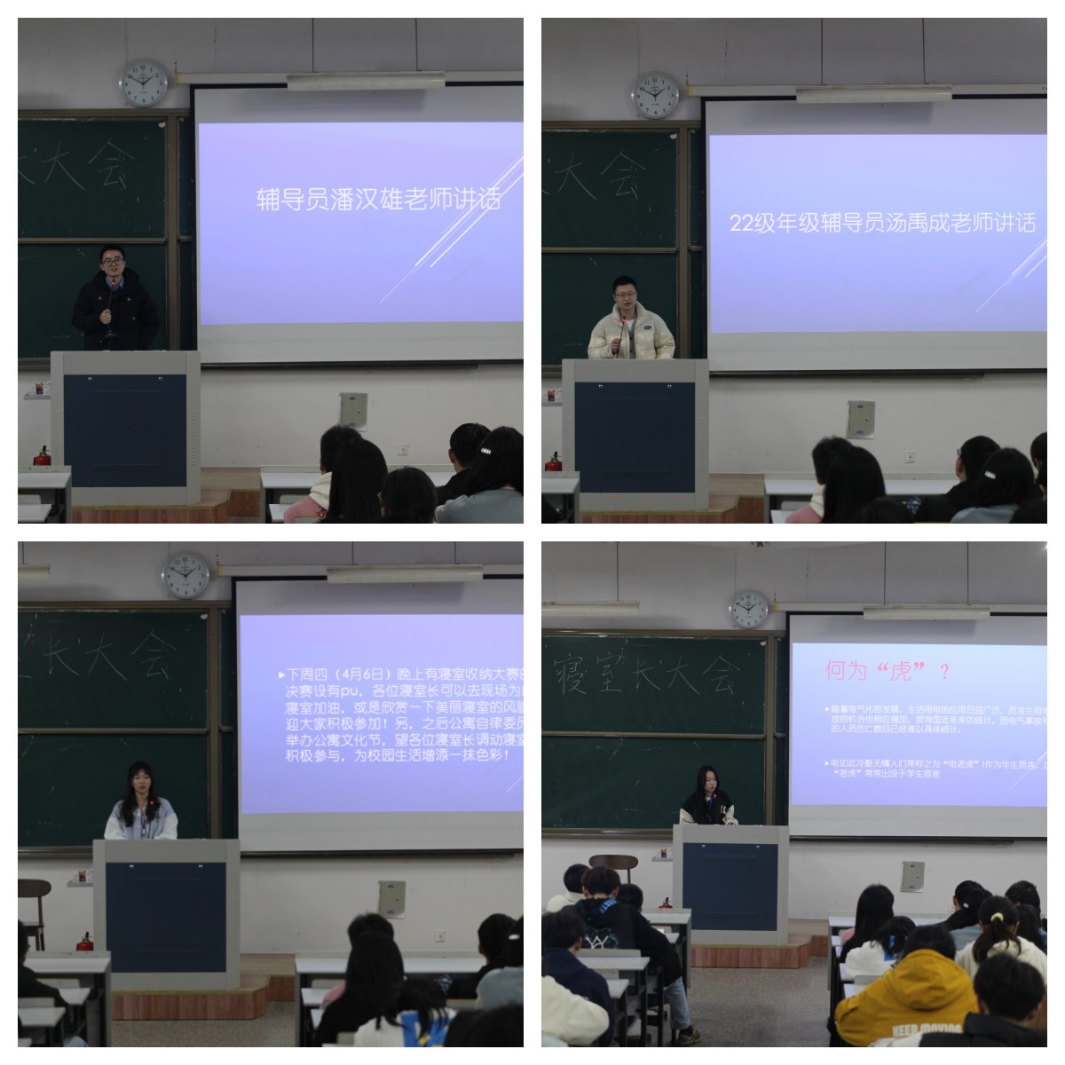 辅导员潘汉雄对寝室隐患专项排查中发现的问题进行了现场通报,以案例方式说明了私拉电线、违规使用电器、人走不断电不拔插座等行为所带来的危害和造成的悲剧。公寓自律委员会魏婷介绍了公寓自律委员会的基本职责与工作规范,就寝室安全与心理异常室友的关注提出了建议辅导员汤禹成对近期文明城市迎检工作的注意事项进行了宣传教育。会议还就晚点签到、预防电信网络诈骗、消防安全、晚归不归等方面进行了主题教育。
