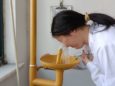 随后梁丹霞向同学进行了紧急喷淋装置专项应急演练培训,并以实验过程中一同学不慎操作把化学试剂溅入眼中为例开展了模拟现场处置演练。同学们演练了事故现场报告、事故现场处置及调查分析等应急处置过程。