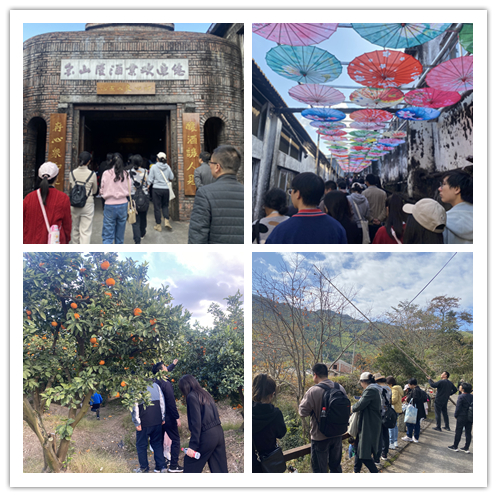 上午,大家来到了黄岩富山大裂谷,亲身感受6000 万年前花岗斑岩山体崩塌形成的现代冰缘地貌及山崩地裂地质遗迹给我们带来的震撼。“山崩地裂露宝藏,财富之旅游富山”的景区宣传语鲜明生动,充满智慧和诱惑,让大家叹为观止。随后,老师们走进非物质文化遗产传承基地——金山陵酒厂,实地探寻古法酿酒技艺,开启一场酒文化之旅。金山陵酒厂糟烧白酒传承发扬了“宁溪传统糟烧酿制技艺”,将传统工艺和现代科技相结合,酿制的糟烧白酒成了江南一绝,被誉为“台州茅台”,也是浙江省目前唯一一个白酒类绿色食品获证产品。下午,大家前往黄岩柑橘博览园,园区内一望无际的桔树,挂满了黄澄澄的桔子。老师们亲自采摘并品尝自己挑选的柑橘,体验了一把橘农丰收的喜悦。