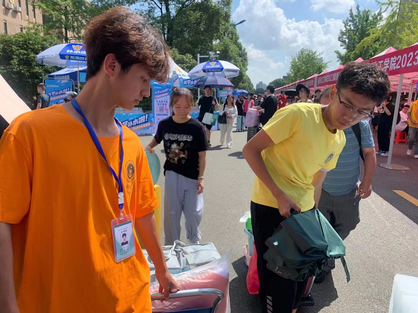 此次学院迎新队伍主要由学生党员,团学会干部以及志愿者们组成,他们分别身着红色、橙色和黄色的志愿服装,辛勤忙碌在迎新的一线,为新生和家长们提供“一对一”服务,帮助新生运送行李,指引路线、办理手续、维持秩序……迎新场上的那抹红、那抹橙和那抹黄,组成了一道道亮丽的风景线,他们用最饱满的热情、最温暖的笑容,让新生感受到来自学院大家庭的浓浓爱意。新生们用学院提前准备好的姓名贴拼成的“参天绿树”创意留影区,则营造了轻松愉悦的迎新氛围,寓意全体新生向阳而生,逐光而行。