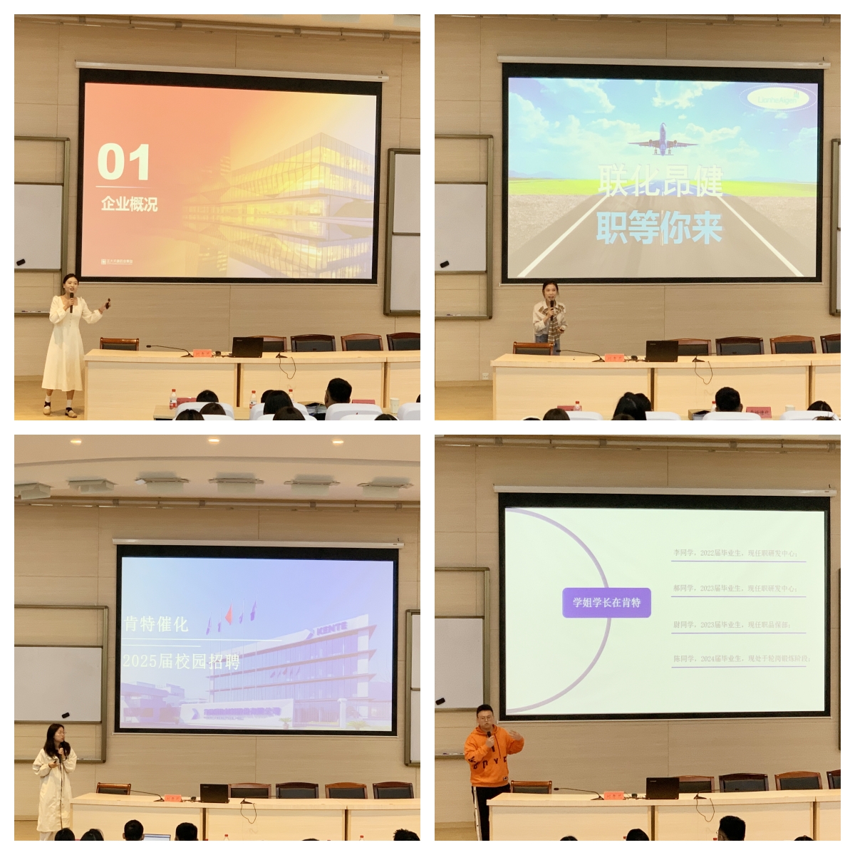 会上,学院还邀请了正大天晴、肯特催化、联化昂健三家企业进行宣讲。各公司HR不仅就公司的概况、企业文化、岗位需求、薪酬待遇以及发展前景等方面进行了全面而深入的介绍,还特别邀请了就职于这些公司往届毕业的校友们现身说法,分享他们的职场经验和心得。宣讲会后,同学们的热情被极大地激发,他们纷纷涌向投递简历的区域,希望能够加入这些在医药化工领域具有影响力的企业。