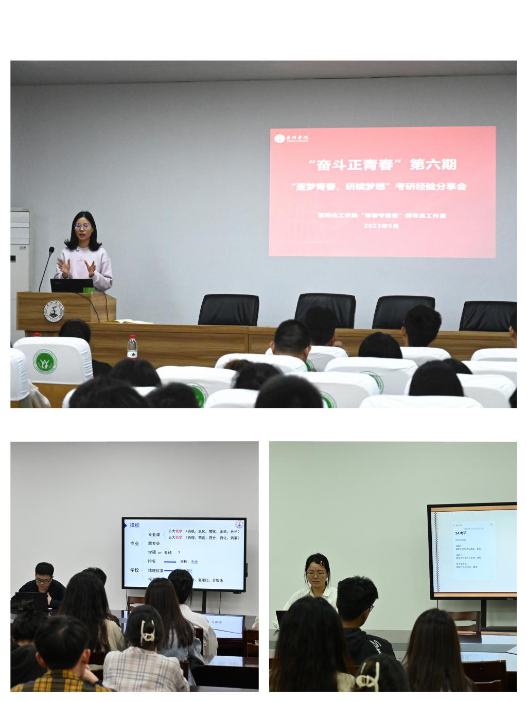 为帮助同学们明确考研方向,梳理考试流程,夯实基础、精准定位、科学备战,5月8日晚上,医药化工学院联合“青春守望者”辅导员工作室开展“奋斗正青春”第六期主题活动。活动以“逐梦青春,‘研’续梦想”为主题,邀请今年考研成功上岸的10位同学分两个专场为学弟学妹们分享考研历程与经验,学院党委副书记刘贵花出席、就业辅导员汤禹成主持会议。