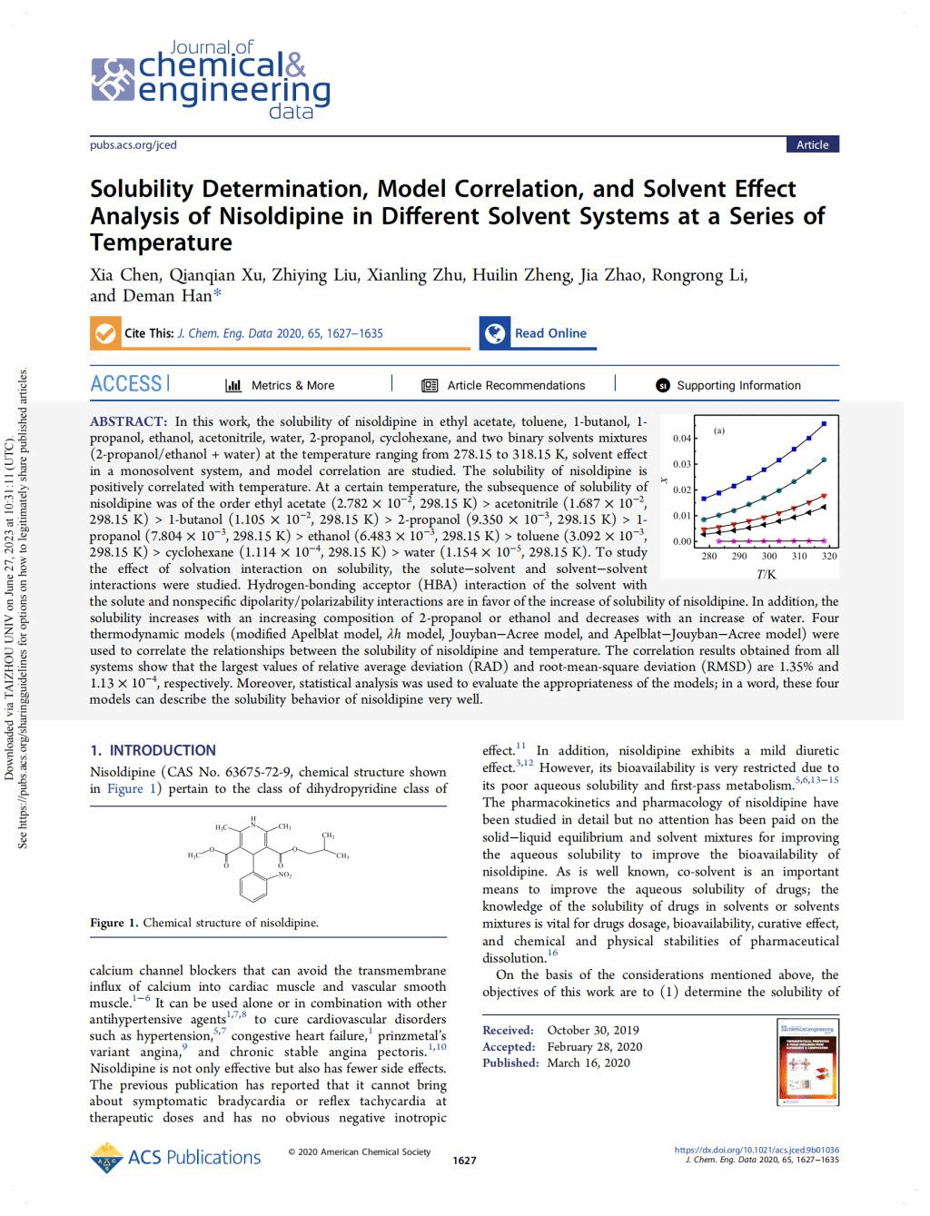 恭贺陈霞、徐倩倩、柳知莹、朱贤琳、郑慧琳、李嵘嵘、韩得满的论文Solubility determination, model correlation, and solvent effect analysis of nisoldipine in different solvent systems at a series of temperature发表在《Journal of Chemical and Engineering Data》期刊上。