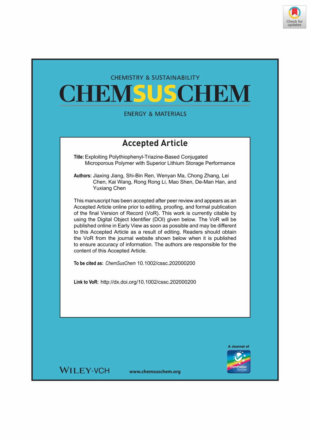 恭贺任世斌、陈磊、王凯、李嵘嵘、沈茂、韩得满、陈宇祥、张嘉馨的论文Exploiting polythiophenyl-triazine-based conjugated microporous polymer with superior lithium-storage performance发表在《ChemSusChem》期刊上。