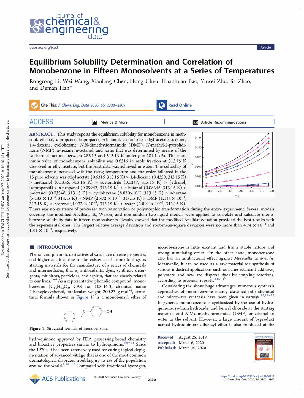 恭贺李嵘嵘、陈先朗、韩得满、陈红、祝瑜蔚的论文Equilibrium solubility determination and correlation of monobenzone in fifteen monosolvents at a series of temperatures发表在《Journal of Chemical and Engineering Data》期刊上。