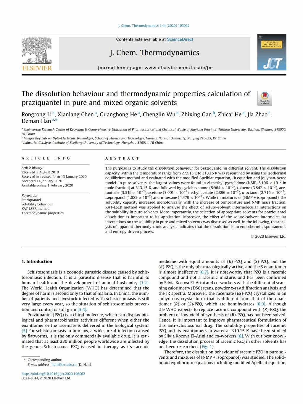 恭贺李嵘嵘、陈先朗、何光洪、武承林、何志才、韩得满的论文The dissolution behaviour and thermodynamic properties calculation of praziquantel in pure and mixed organic solvents发表在《Journal of Chemical Thermodynamics》期刊上。