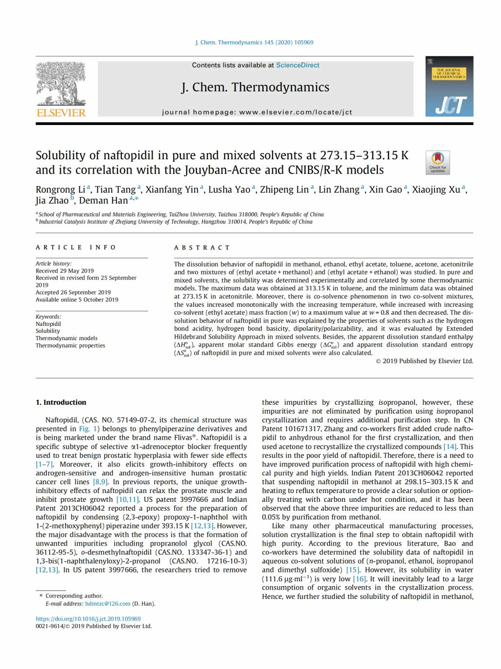恭贺李嵘嵘、唐甜、殷现芳、姚露莎、林志鹏、高欣、徐肖静、韩得满的论文Solubility of naftopidil in pure and mixed solvents at 273.15-313.15 k and its correlation with the Jouyban-Acree and CNIBS/R-K models发表在《Journal of Chemical Thermodynamics》期刊上。