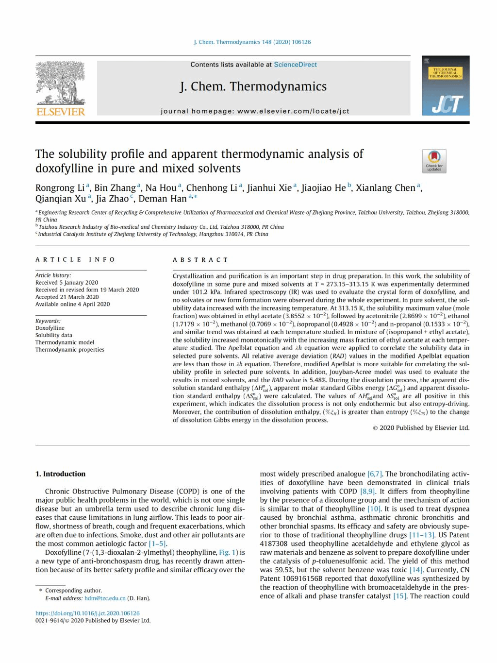 恭贺李嵘嵘、张斌、侯娜、李呈宏、谢建辉、陈先朗、徐倩倩、韩得满的论文The solubility profile and apparent thermodynamic analysis of doxofylline in pure and mixed solvents发表在《Journal of Chemical Thermodynamics》期刊上。