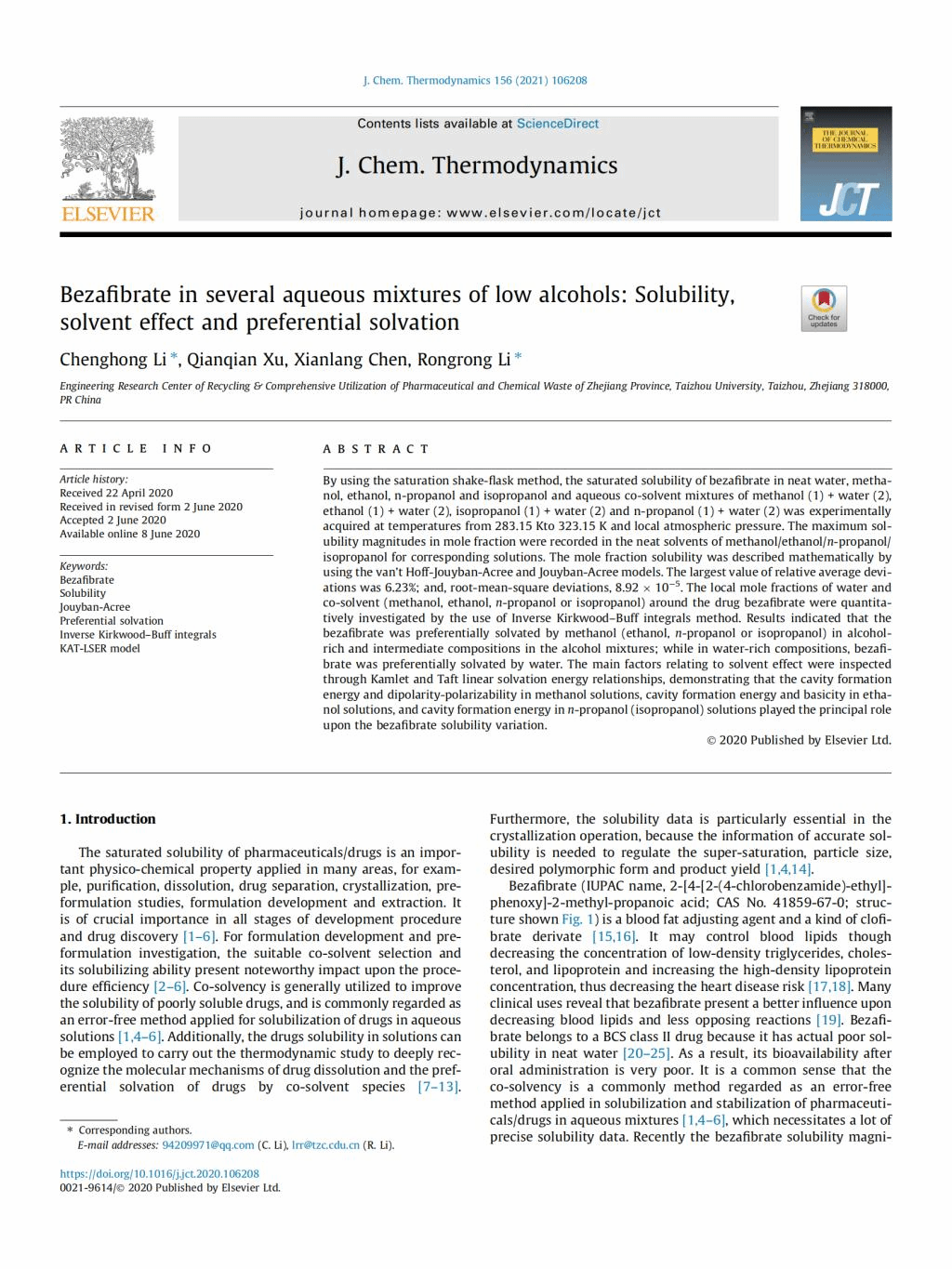 恭贺李呈宏、徐倩倩、李嵘嵘、陈先朗的论文Bezafibrate in several aqueous mixtures of low alcohols: solubility, solvent effect and preferential solvation发表在《Journal of Chemical Thermodynamics》期刊上。