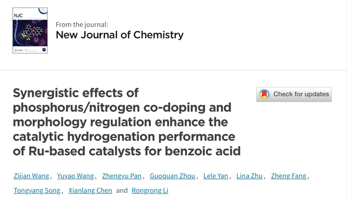 由工程中心陈先朗、李嵘嵘老师指导本科生的一作研究成果“Synergistic effects of phosphorus/nitrogen co-doping and morphology regulation enhance the catalytic hydrogenation performance of Ru-based catalysts for benzoic acid”(《磷/氮共掺杂和形貌调控的协同效应增强钌基催化剂苯甲酸催化加氢性能》)近日在线发表于国际权威化学期刊New Journal of Chemical(新化学杂志,NJC)。