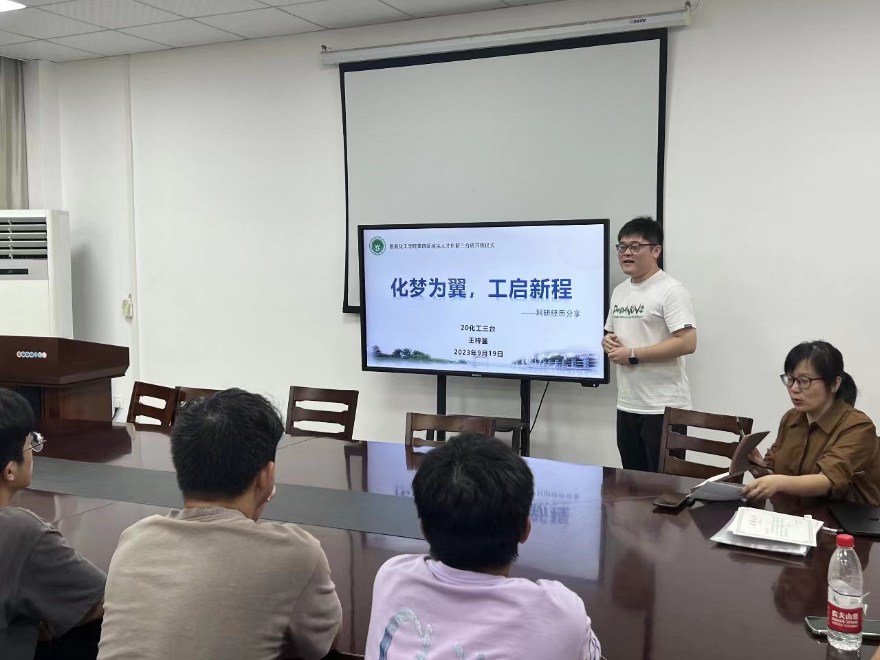 会上,首先吴劼根据本届化工(三台班)的学情情况进行分析,介绍了首届化工(三台班)、团队里面其他学生的学习和考研经验,提出两点要求,一是目标坚定,提早规划好考研方向;二是自律坚持,充分利用时间充实自己。随后,20级化工(三台班)王梓鉴同学为22化工(三台班)做了“化梦为翼、工启新程”的科研经历分享报告,他介绍了自己在两年时间独立实验、撰写发表两篇SCI论文、一项发明专利的经历,从早上五点起来实验、到晚上十点离开实验室,鼓励同学们勤勉努力,在大学追逐光、成为光。班主任的鼓励和学长的经验分享赢得了同学们的阵阵掌声。