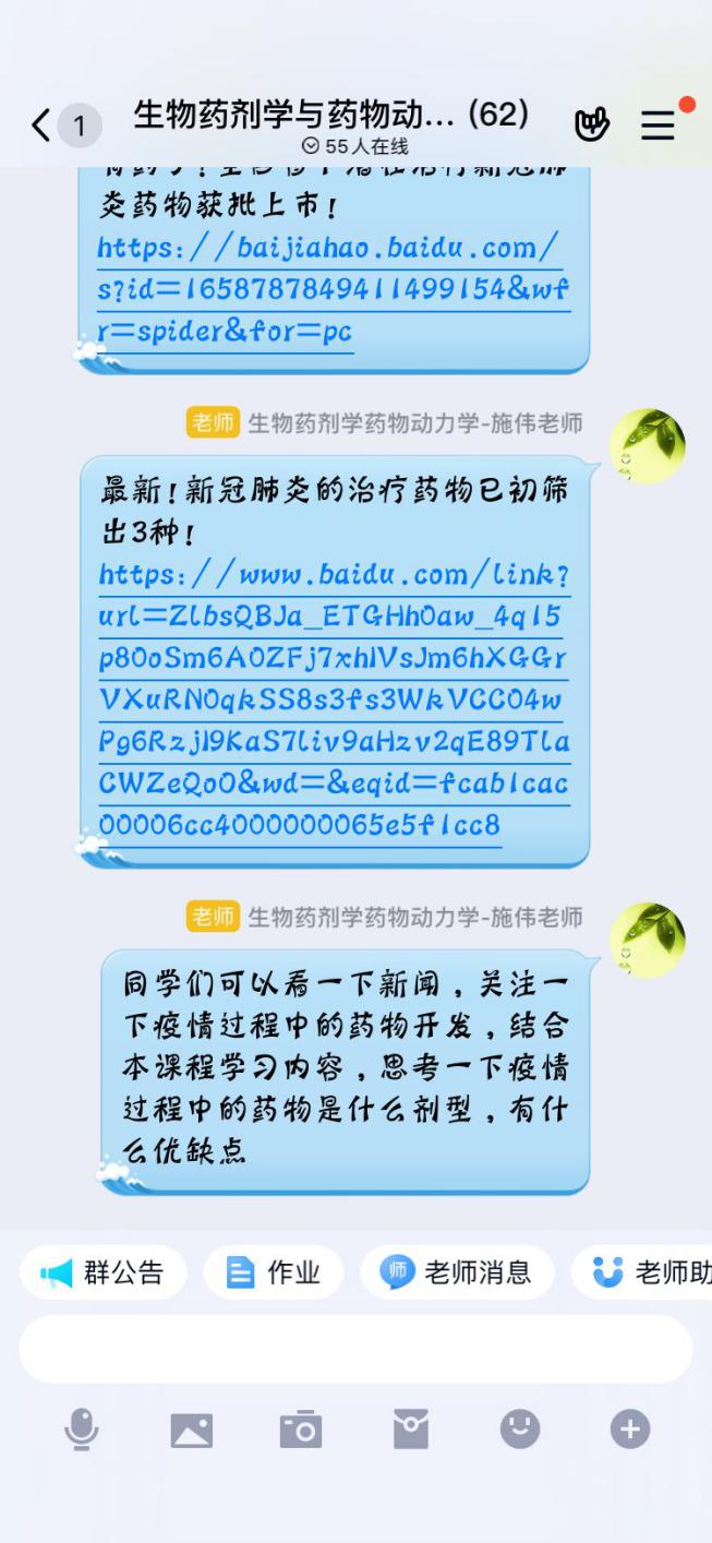 同时,我们惊喜地发现,按照医化学院原定的“课程思政一二三”的思政探索,很多任课老师在线上教学中贯彻了疫情阶段下的“思政教育”,遵循以学生为中心、以需要为引领、以问题为导向的三大原则。有机化学、药物分析、生物药剂学与药物动力学、高分子化学等课程在授课中以“新冠病毒”相关的知识点引入教学内容,融入鲜明的时代特征和新时代的社会需求,有利于激发学生的学习兴趣,培养新时代学生的爱国情怀。