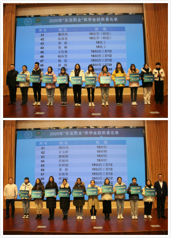 随后,夏道敏代表浙江东亚药业股份有限公司向学院捐赠10万元奖学金。吴高都宣读了《医药化工与材料工程学院2020年“东亚药业”奖学金评定办法》,张梅芬等为100位“东亚药业”奖学金获得者一一颁奖。17制药工程12班应佳萍代表获奖学生发言。