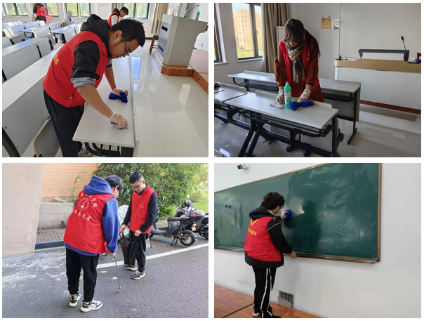 学院25位青年志愿者携带抹布、钢丝球、刷子、垃圾夹等工具,分成4组,分别对4号、5号、6号教学楼教室及学院大楼周边进行清理,特别对教室内课桌椅涂鸦、校园内草丛垃圾等现象进行清洁和清扫。志愿者们积极投入劳动,坚持不放过任何一个卫生死角,在活动过程中交流互助,凭借着良好的团队意识,以极高的效率圆满完成了此次志愿工作。他们纷纷表示,校园环境是学生学习生活的重要场所,它直接关系到学生的情感体验、学习效果和健康成长,营造一个舒适、安全、健康、美丽的校园环境,是提高学生综合素质的重要保障。希望今后继续身体力行参与更多的志愿服务活动,回馈学校与社会。
