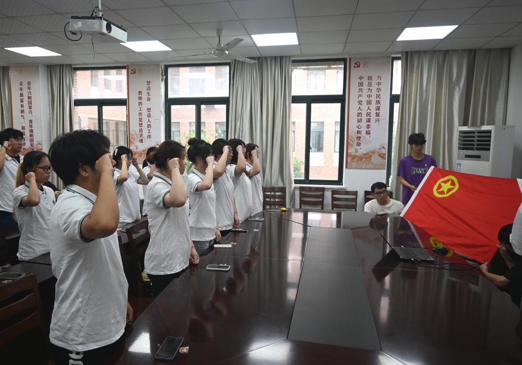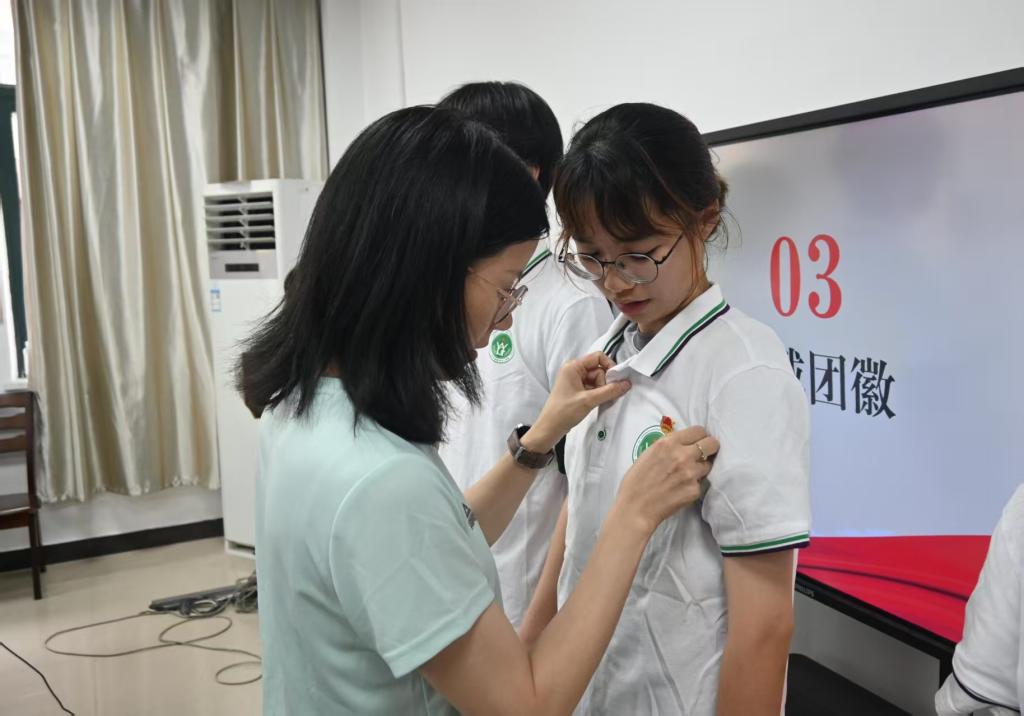 为新团员佩戴团徽