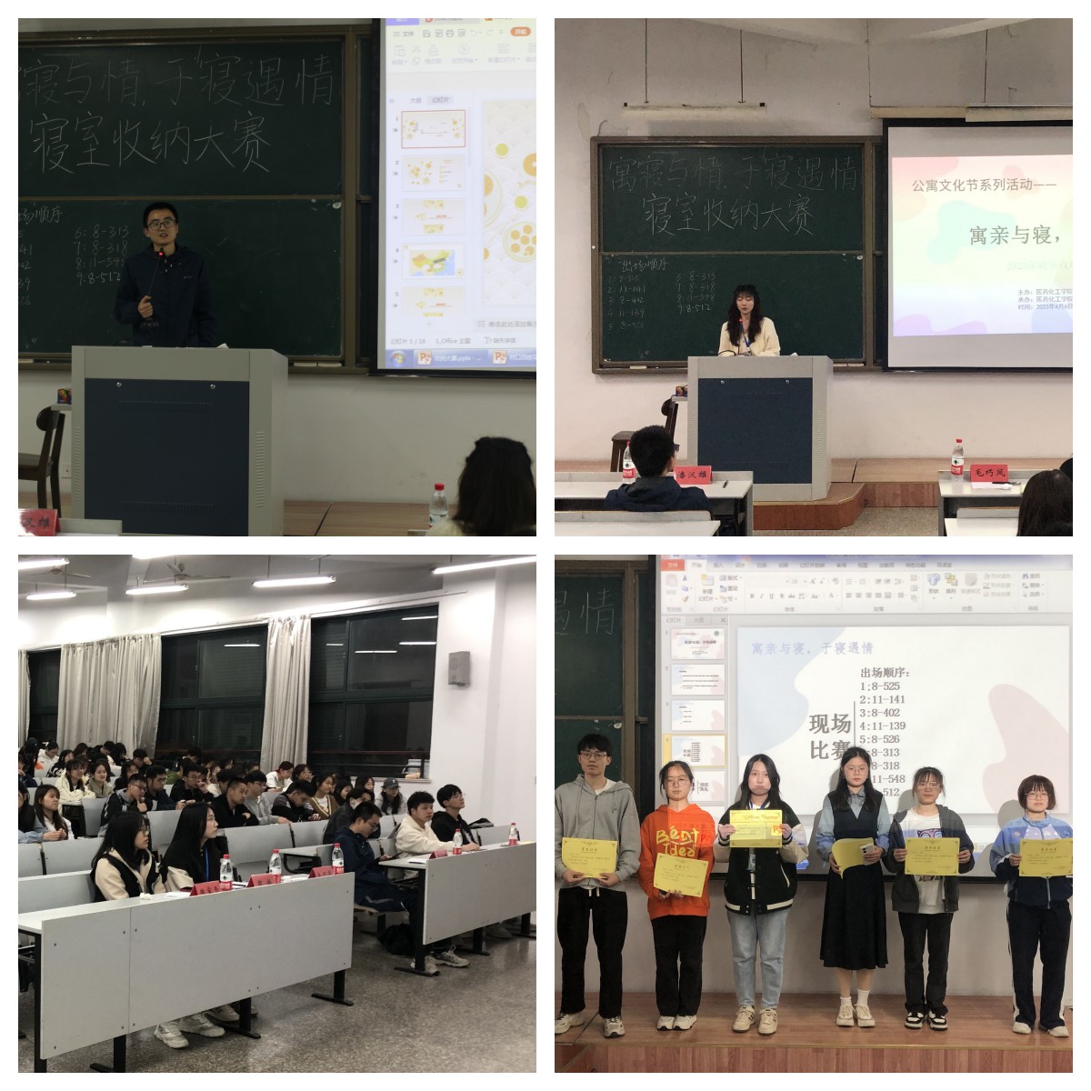 为营造美丽整洁的寝室氛围,进一步推进文明寝室建设,46,医药化工学院在教学楼2-301举办了公寓文化节之寓寝于情,于寝遇情寝室收纳大赛决赛,公寓辅导员潘汉雄和团学会公寓自律委员会成员担任评委,学院团学会主席团成员毛巧凤主持。