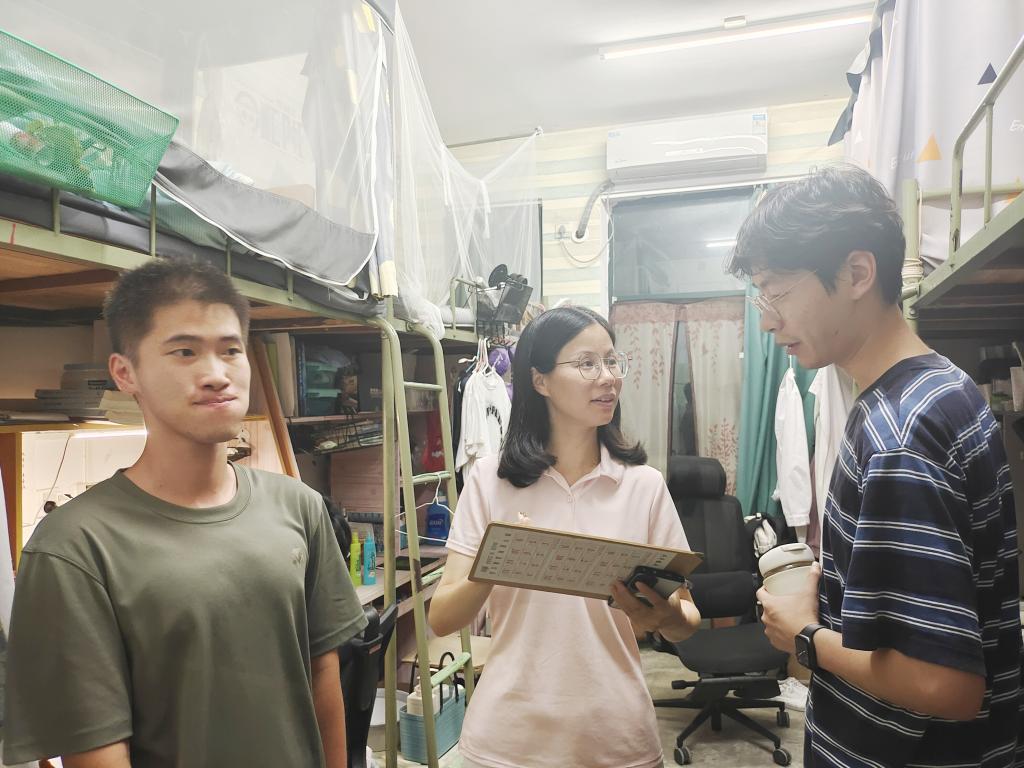 在走访过程中,刘贵花向同学们转达了学校、学院领导和老师对留校学生的关心关爱,并与同学们进行深入交流,了解同学们留校期间的学习计划、科研实验规划,询问学生的食宿、兼职等日常生活状况,提醒同学们要提升安全防范意识,自觉遵守学校的各项规章制度。走访小组还重点检查了学生寝室的卫生以及安全隐患,对于排查出来的安全隐患作了详细登记,要求当场立行立改,并在留校学生安全工作群和学院学生干部群进行通报批评。