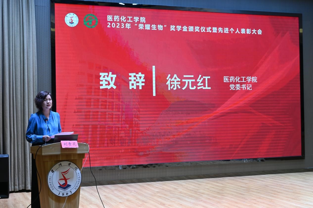 4月18日下午,医化学院在椒江校区大学生活动中心举行2023年“荣耀生物”奖学金颁奖仪式暨先进个人表彰大会。浙江荣耀生物科技股份有限公司总经理助理兼质管部部长李林玲、台州学院教育发展基金会秘书长郑晓莉、医化学院党委书记徐元红、副院长黄国波、余彬彬出席,学院系主任、辅导员以及学生代表参加。仪式由学院党委副书记刘贵花主持。