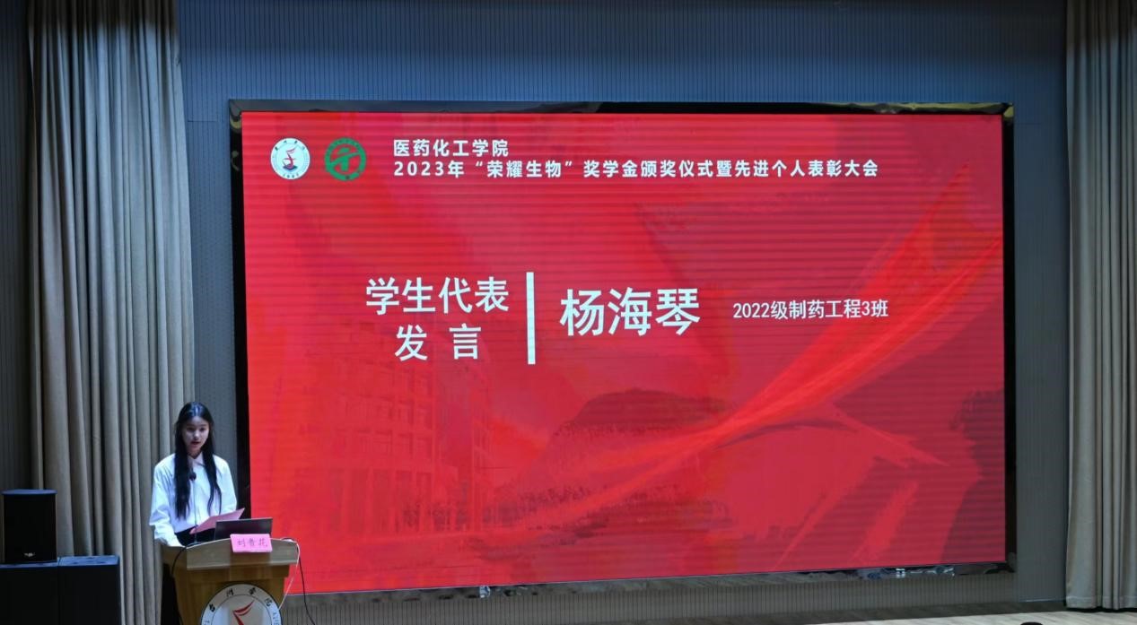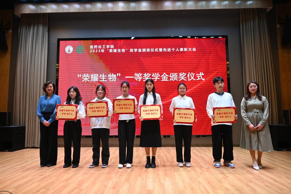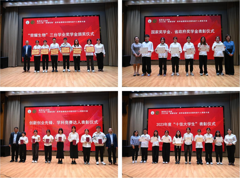会上,刘贵花宣读了2022-2023学年“荣耀生物”奖学金获奖学生和受表彰学生名单。各位领导和嘉宾分批次为“荣耀生物”三台奖学金、“荣耀生物”三等奖学金、“荣耀生物”二等奖学金、“荣耀生物”一等奖学金、十佳大学生、十佳创新创业先锋、学科竞赛达人、国家奖学金和省政府奖学金等获奖学生代表颁发奖状和荣誉证书。