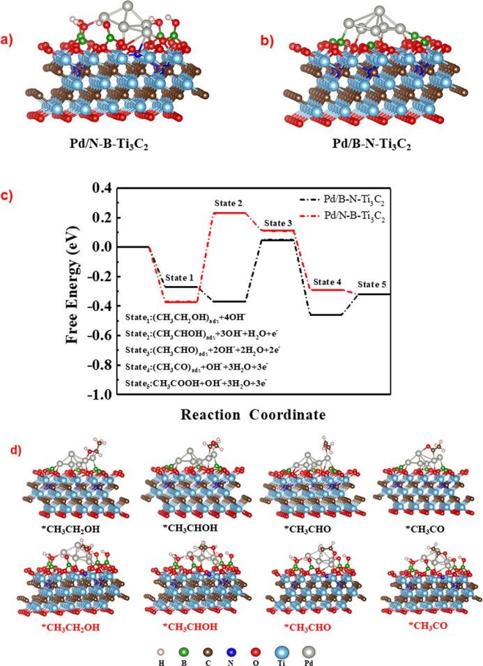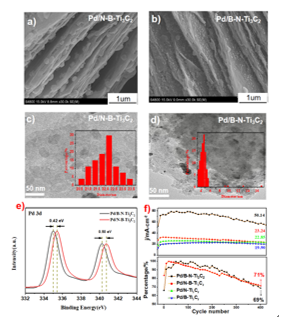 在众多醇类电氧化催化剂中,Pd基催化剂作为碱性条件下常用催化剂备受关注,但其存在催化活性不高或者稳定性差的问题。金燕仙、陈章新团队成功地在提高Pd分散性的同时实现了对Pd金属电子结构的调控:使用B元素和N元素共同掺杂的MXene材料作为载体。其中,以先B后N为掺杂顺序得到的催化剂中存在更多的B元素种类,能够为乙醇电氧化过程中脱氢产生的H原子提供位点降低反应自由能,提高催化剂催化活性(74.62 mA·cm–2);同时削弱金属Pd与反应副产物CO之间的吸附,增强催化剂的抗中毒能力,从而提高其工作稳定性,具体表现为在400次循环后仍保持其最高性能的71%。