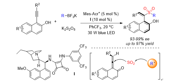 吴劼教授团队近年来一直致力于磺酰药物导向的二氧化硫参与的转化研究,并利用二氧化硫插入策略发展了一系列结构多样的磺酰类化合物的合成方法。该论文在课题组前期的工作基础上,利用光诱导不对称自由基反应,以亚硫酸盐为二氧化硫的来源,通过自由基加成途径实现了苯乙烯型轴手性骨架结构的构建:以烷基氟硼酸钾为原料,在光诱导下产生自由基,随后捕获二氧化硫生成磺酰基自由基,其对联烯醌关键中间体进行不对称加成,最后经过还原质子化,成功实现了磺酰基取代苯乙烯型轴手性类化合物的高效立体选择性合成。此外,DFT计算详细阐述了该反应的机理和手性转移过程,为反应机理提供了理论依据。