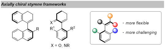 轴手性类化合物不仅是药物合成中众多手性配体和手性催化剂的核心骨架,而且也广泛存在于许多天然产物和药物活性分子中。因此催化不对称合成各类轴手性骨架吸引了众多有机化学家的关注。在这些报道之中,苯乙烯型轴手性类骨架的构建研究得相对较少,主要是由于此类骨架旋转能垒低,稳定性较差,立体选择性难以控制。因此,针对此类骨架的催化不对称合成为一个颇具挑战性的课题。