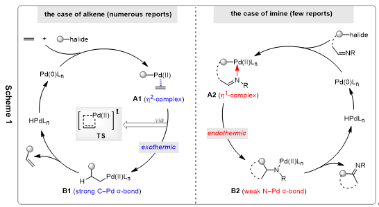(1)烯烃可以通过η2-配位形成π络合物A1,其易发展成 [2p + 2s]的过渡态TS,使得烯烃双键快速迁移插入形成中间体B1。如以亚胺C=NR为例,其更加倾向于形成η1-亚氨钯络合物A2。此η1-配位模式显然无法形成类似的四元过渡态,从而使得C=N插入C–Pd(II)键相对不利。