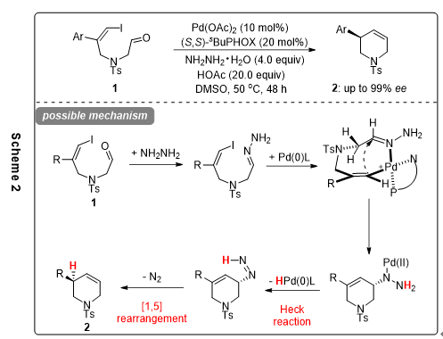 针对上述难题,该研究工作另辟蹊径,结合金属催化的腙(C=N-NH2)反应化学和对碳-杂原子双键的Heck反应的思考,探索腙的Heck反应。经过反应底物和催化体系的合理设计、反复优化,最终不仅实现了Pd(0)-催化腙的Heck反应,而且可以用常规PHOX手性配体实现不对称催化。该反应通过腙的插入和高区域选择性的β-H消除得到Heck反应产物,再经由氮烯的[1,5]-重排实现串联转化,高效构筑光学纯度高达99%的3-取代四氢吡啶骨架(Scheme 2)。