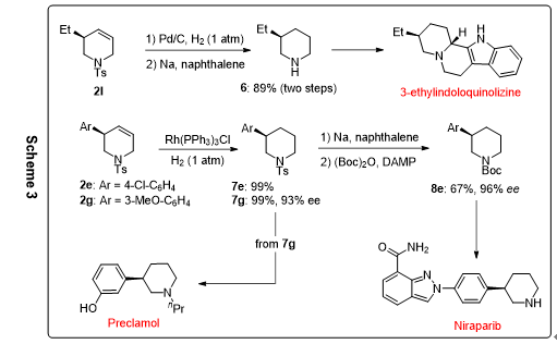 利用该串联反应方法学制备得到的3-取代四氢吡啶产物,经由简单转化即可实现天然产物3-ethylindoloquinolizine以及两种药物丙克拉莫(Preclamol)、尼拉帕尼(Niraparib)形式上的不对称合成(Scheme 3)。