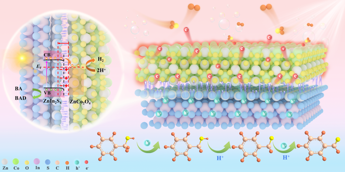5、开发ZnIn2S4/ZnCo2S4晶格匹配异质结(晶格失配仅0.05%),通过内建电场与氢溢流效应实现电子-质子同步传输,析氢速率达70.3mmolg-1h-1,苯甲醛选择性氧化效率39.3mmolg-1h-1(选择性93.6%),解决了光催化反应中电荷分离与质子传输异步的关键瓶颈。(Sci.ChinaMater.,2026,DOI:10.1007/s40843-025-3889-6)