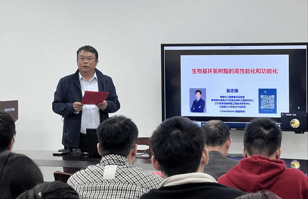 大连理工大学翁志焕教授的报告关注了生物基环氧树脂绿色化、高性能化和功能化,并从生物基环氧树脂分子结构设计及合成策略;本征阻燃、强韧兼备生物基环氧树脂制备方法;生物基环氧树脂功能化及应用探索;生物基环氧树脂的内降解回收等四个方面展开交流。他分享了环氧树脂在航空材料、电子元器件粘接材料、涂料、复合材料等领域广泛应用,指出了当前石油基环氧树脂面临的资源紧张和环境污染等问题,阐述了团队如何通过设计、合成带有杂环、脂肪环和芳香环的生物基化合物代替石油基双酚用于制备环氧树脂,进而实现了生物基环氧树脂的高耐热性、自增韧、本征阻燃等特性。翁教授还强调了生物基环氧树脂的可持续发展和环保优势,为未来的材料科学研究提供了新的方向。