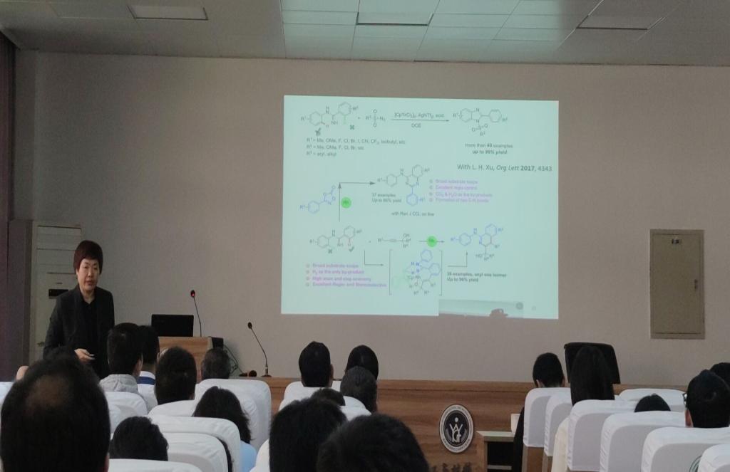杨震教授围绕“一种绿色可持续的化学方法不对称合成天然萜类化合物”,介绍了若干具有重要活性的天然产物全合成研究,包括发展高效、新颖的合成方法学应用于具有生物活性的复杂天然产物和小分子化合物的全合成之中。祝诗发教授围绕“碳碳三键化学”,介绍了其团队在过渡金属催化炔烃的高效转化领域取得的一系列研究进展,及其在药物活性片段合成中的应用。李绍玉教授团队发展了多种不对称催化策略,成功构建了系列轴手性骨架化合物,并将之用于一些手性药物的合成之中。崔秀灵教授围绕“金属催化C-H 键官能团化反应”,逐一介绍了近年来其课题组用于构建杂环骨架的合成方法及其后续生物测试研究结果。